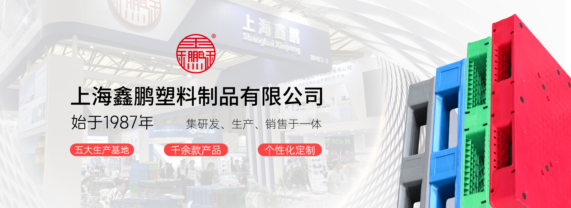上海鑫鹏塑料创始于1987年,始终专注深根塑料产业链,业务板块包括:塑料原料贸易、塑料制品研发制造(塑料托盘、塑料箱筐、卡板箱、环卫桶等)。现全国有5个生产基地:上海2个、四川1个、江苏2个。